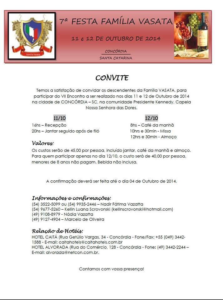 OBS: Dom Ângelo está escrevendo um livro sobre a família Vasata que já consta com 280 páginas, solicito a todos a colaboração com informações. No site atual é publicado apenas nome e sobrenome preservando a privacidade, mas no livro é necessário mais informações, como por exemplo: data de nascimento, mome e sobrenome do cônjuge, endereço, telefone, email e data de falecimento. Quanto mais informações forem enviadas, mais rico de conteúdo o livro vai ficar. Quem tiver interesse pode enviar um email com informações, fotos atuais/antigas e documentos antigos.